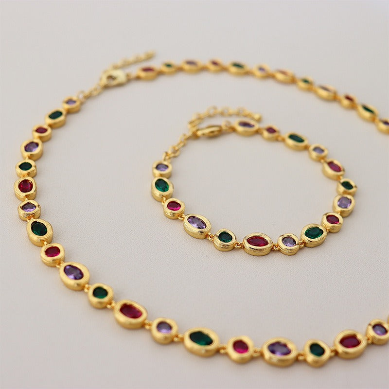 Light luxury fashionable colourful zircon necklace for women versatile personalized retro niche bracelet set